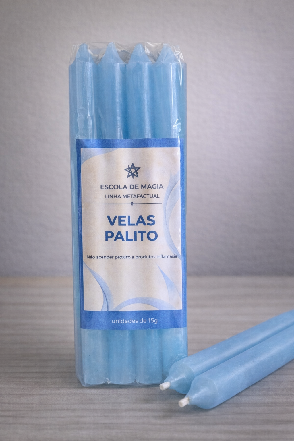 Vela palito azul claro 15g, pacote com 8 unidades. Indicada para práticas de comunicação, serenidade e harmonização emocional.